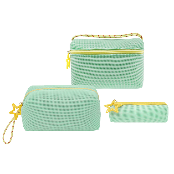 Three-piece cosmetic bag sets provide optimal organization through graduated sizes that separate different product categories. Large bags store full-size items, medium ones hold daily essentials, and small pouches organize travel or touch-up products efficiently.