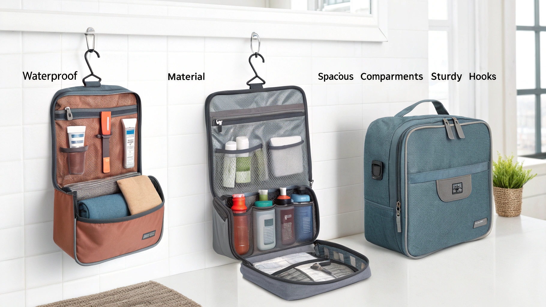 Choose toiletry bags with waterproof lining, hanging hooks, and multiple compartments sized for full-size bottles. Look for bags measuring 10x8x4 inches minimum to accommodate shampoo, conditioner, and body wash containers.
