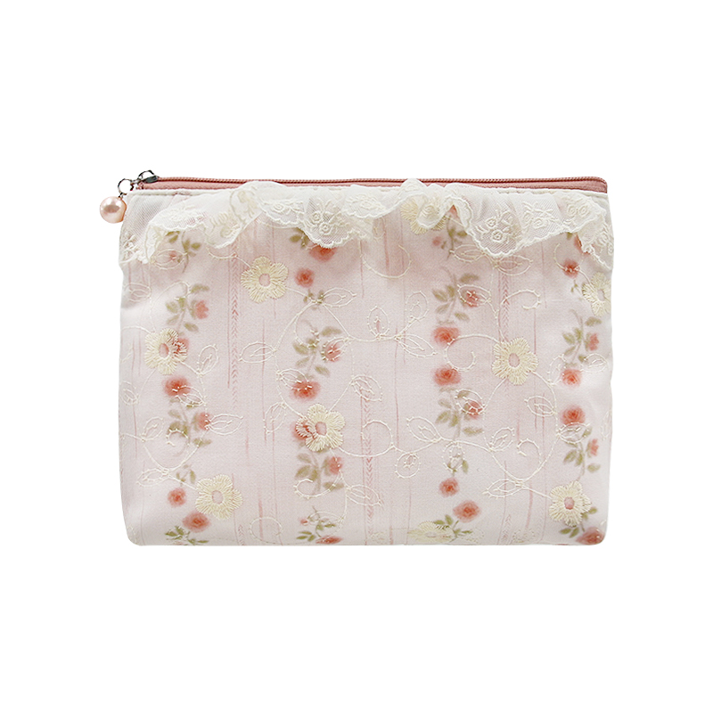 Q&N Floral Print Pouch Lace Trim Fabric Bag Zipper Closure Cosmetic Case | Stylish Women's Organizer with Soft Cotton Material