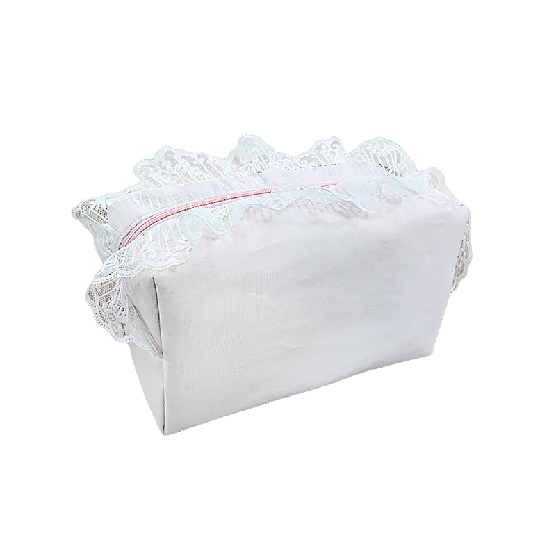 Q&N Lace Trim Cosmetic Bag White Fabric Zipper Pouch Elegant Travel Organizer | Stylish Women's Makeup Bag with Delicate