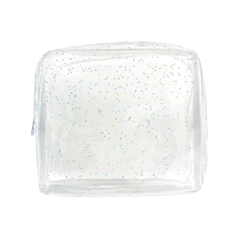 Transparent PVC with subtle glitter—instant visibility for quick packing and security checks; easy to wipe clean and water resistant.