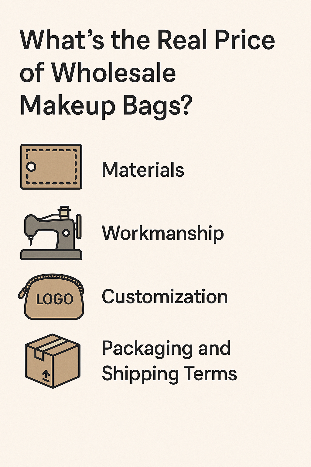 Wholesale makeup bag pricing is not just “a number per piece.” The real price includes materials, workmanship, customization, packaging, and shipping terms. If you only compare the lowest quote, you may pay more later through delays, defects, or unexpected fees.